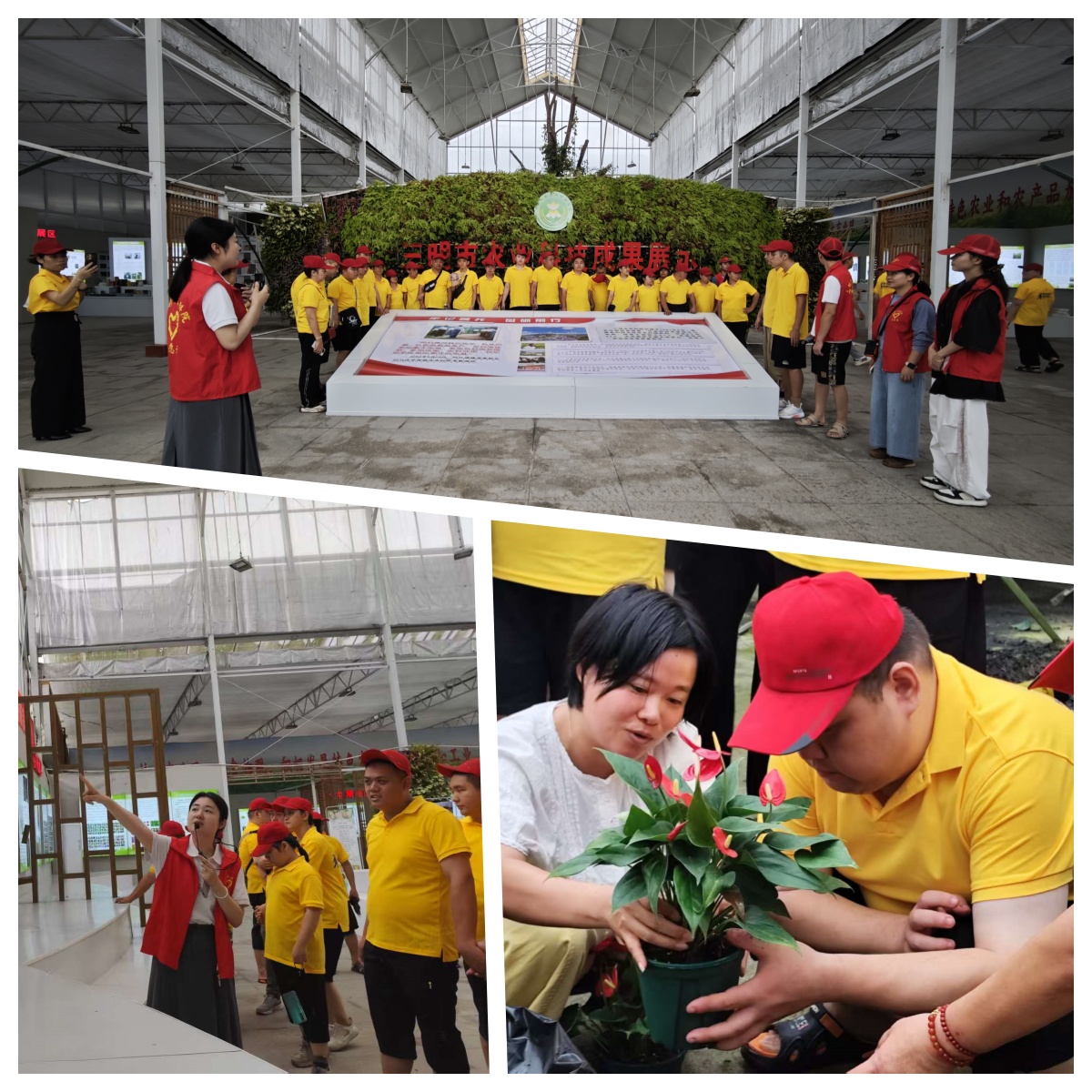 活动首站来到道堂洋科研基地,志愿者用通俗易懂的语言,向学员们介绍水稻、山药、菊花等植物的生长特性,大家好奇地观察,触摸,感受自然生命的奥秘。随后,大家移步到玻璃展厅,琳琅满目的3D打印模型和农业科技应用成果吸引学员驻足观看,志愿者通过互动问答,生动讲解现代农业技术如何改变生活。最受欢迎的环节在生态餐厅旁的红掌大棚展开,农科院技术人员现场演示红掌盆栽的种植技巧,学员们亲手栽苗,在志愿者“一对一”协助下,完成了一盆盆专属自己的红掌盆栽。