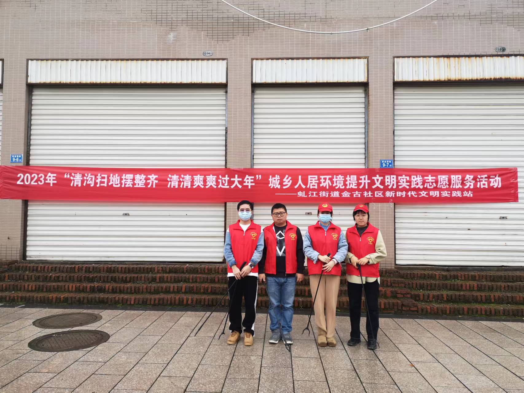 1月13日,组织志愿者对金古社区的道路两旁、人行道地面、小区墙面和楼道等卫生死角等进行卫生大清扫,并引导行人居民不乱丢垃圾、烟头,不乱贴乱画,车辆有序停放。活动过程中还发放禁毒禁赌倡议书,倡导居民文明健康过年,要警惕以过节名义作出违法犯罪行为。对待疫情仍需警惕,倡导广大市民不举办、不参加规模聚集活动,养成良好的文明卫生习惯,清清爽爽、轻轻松松过文明新年。